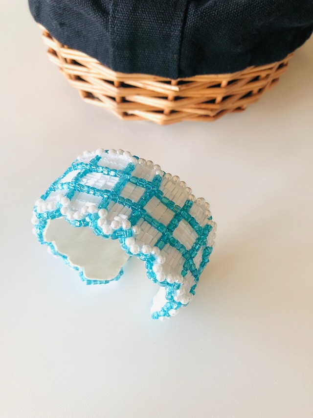スカラップ型のデザインが特徴のバングルです。透明感があり爽やかなソーダ色のビーズと、光を浴びて煌めくホワイトカラーの小竹ビーズのコントラストが最高な一品!ビーズ数も多いこちらのアイテムは縫い付けに時間を掛け、丁寧に仕上げています。ワイヤー入りなので、お好みのフィット感に調整可能。 アーチ状のスカラップデザインが手元を美しく引き立て、シンプルながらも存在感がある一品に仕上がっています。 【サイズ】全長約17cm 【素材】ガラスビーズ パールビーズ ワイヤー 合成皮革 手作業のため、全て一点物となります。 お使いの端末や閲覧環境により、写真と実物の色味や質感が多少異なって見えることがございます。