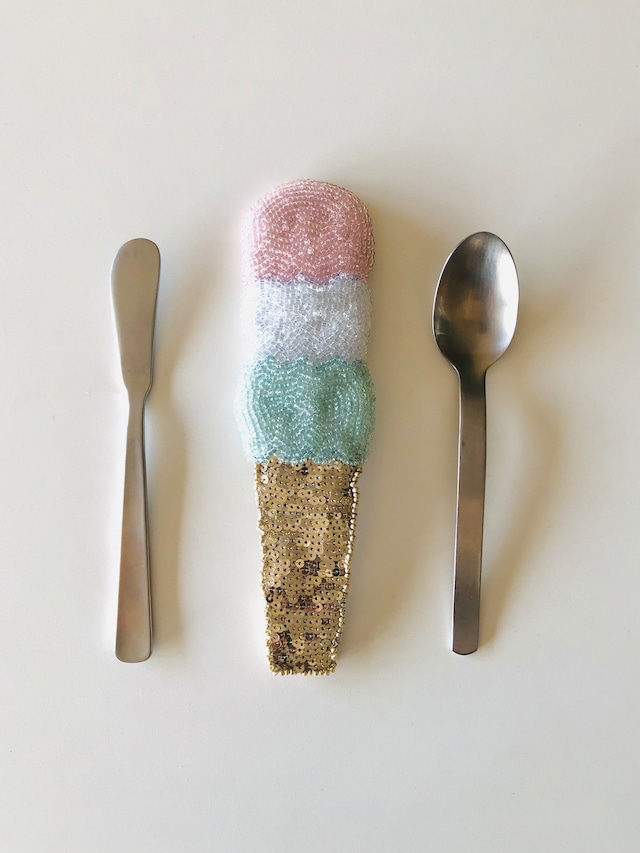 爽やかさと可愛らしさを感じさせるデザインが特徴のトリプルアイスバングル♡ シンプルながらも印象的なバングルに仕上げました。透け感のあるライトピンク、クリア、ミントグリーンの涼しげなトーンとコーン部分にはゴールドのスパンコールを丁寧に配置。手首に付けるとアイスとは分からないのも特徴。 デイリーユースはもちろん、軽やかな着け心地。内部にワイヤーが入っているので、ご自身のお好みのサイズに調節可能です。着脱もストレスフリーなのが嬉しいポイントです! 【サイズ】全長約16.5cm 【素材】ガラスビーズ スパンコール 合成樹脂 手作業のため、全て一点物となります。 お使いの端末や閲覧環境により、写真と実物の色味や質感が多少異なって見えることがございます。