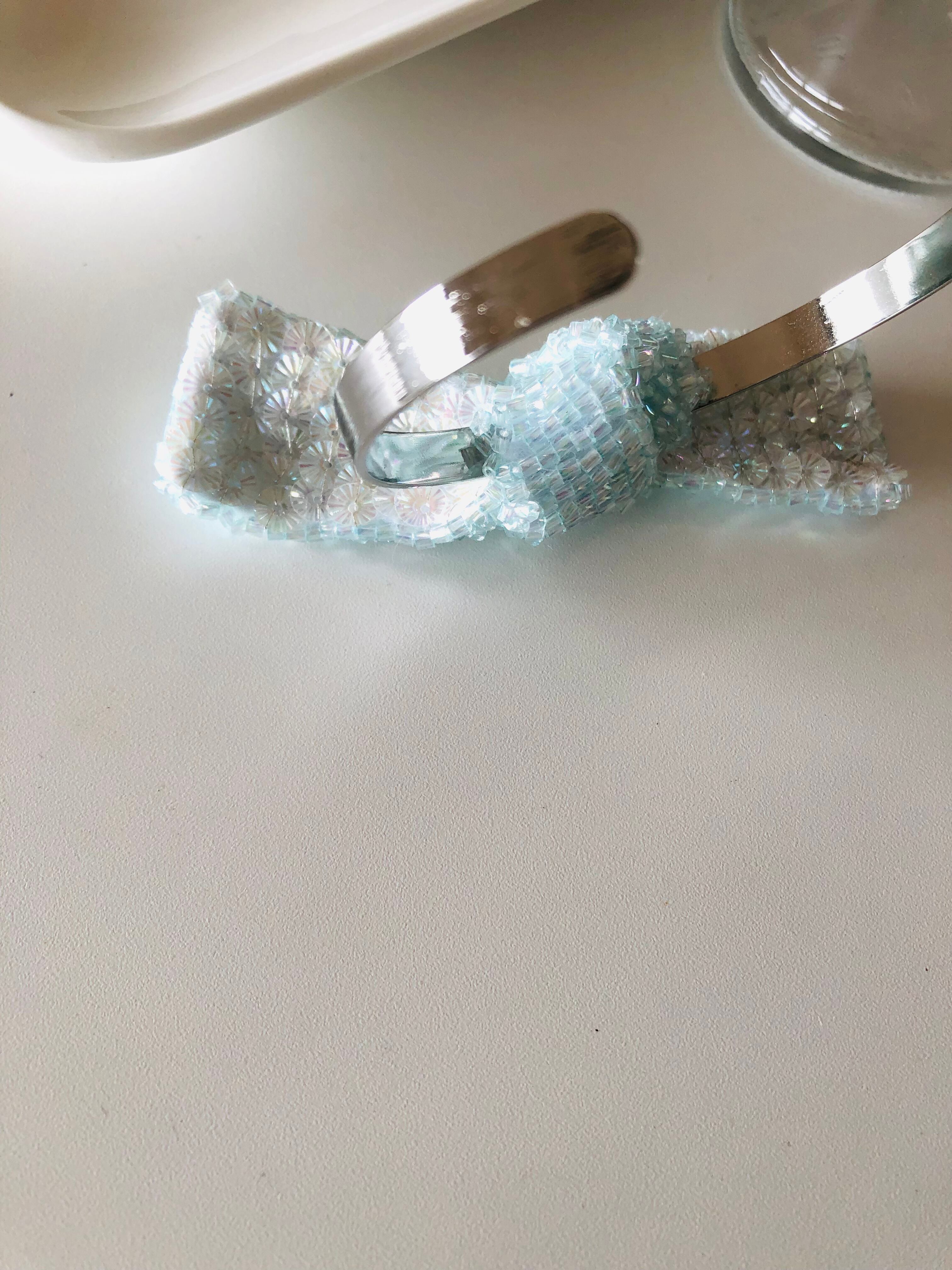 ライトブルーのビーズに光を受けてきらめくスパンコールが絶妙に組み合わされており、どんなシーンでも華やかさを添えてくれます。