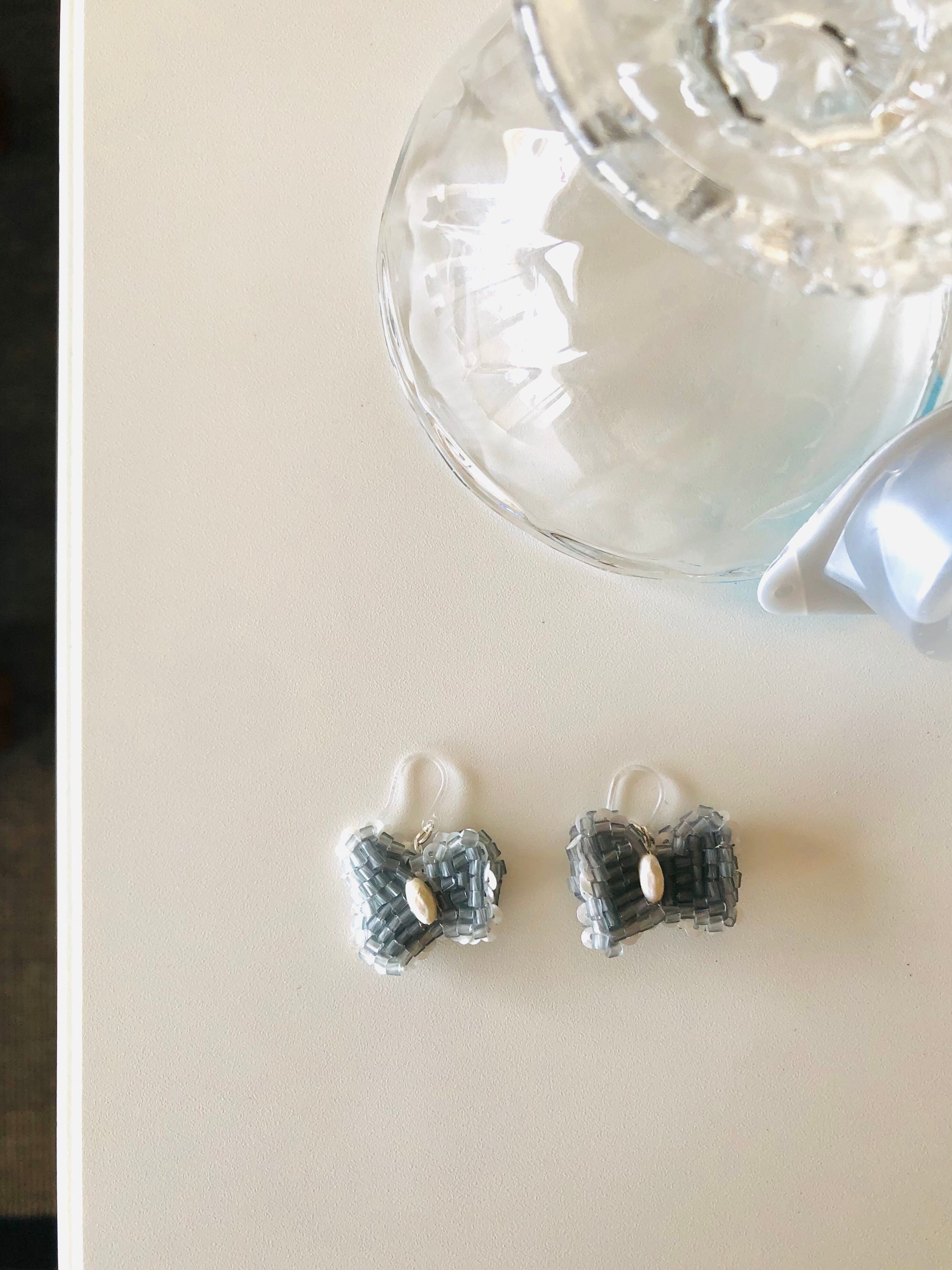 シアー感のあるグレーのガラスビーズでリボンをデザイン。中心には、ライス型のコットンパールをリボンの両面にトッピング!縁にはフランス製のスパンコールが施され、まるでレースのような繊細さを演出。