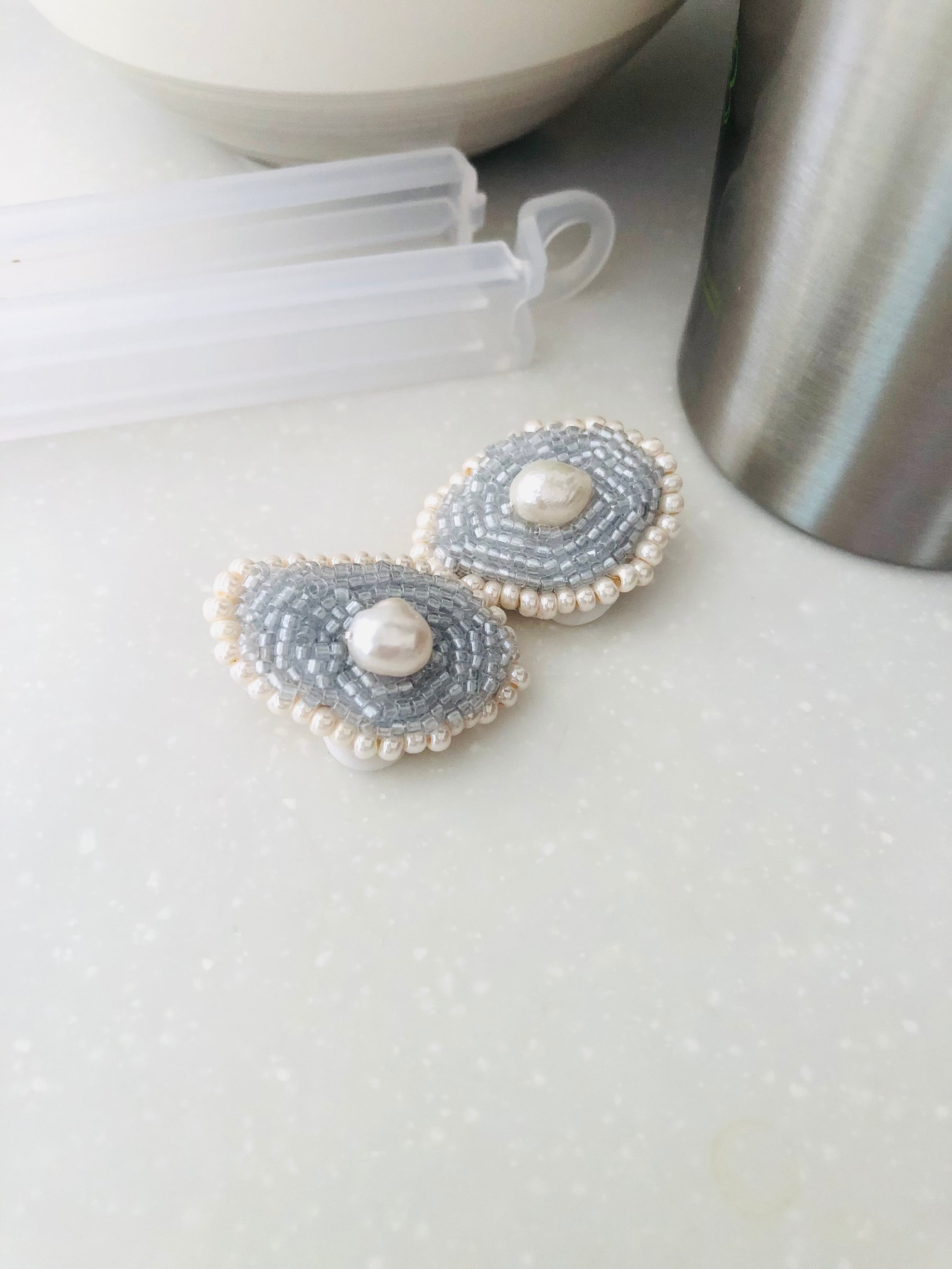 爽やかなブルーグレーのビーズ、中心には淡水パールを丁寧に縫い付けて。