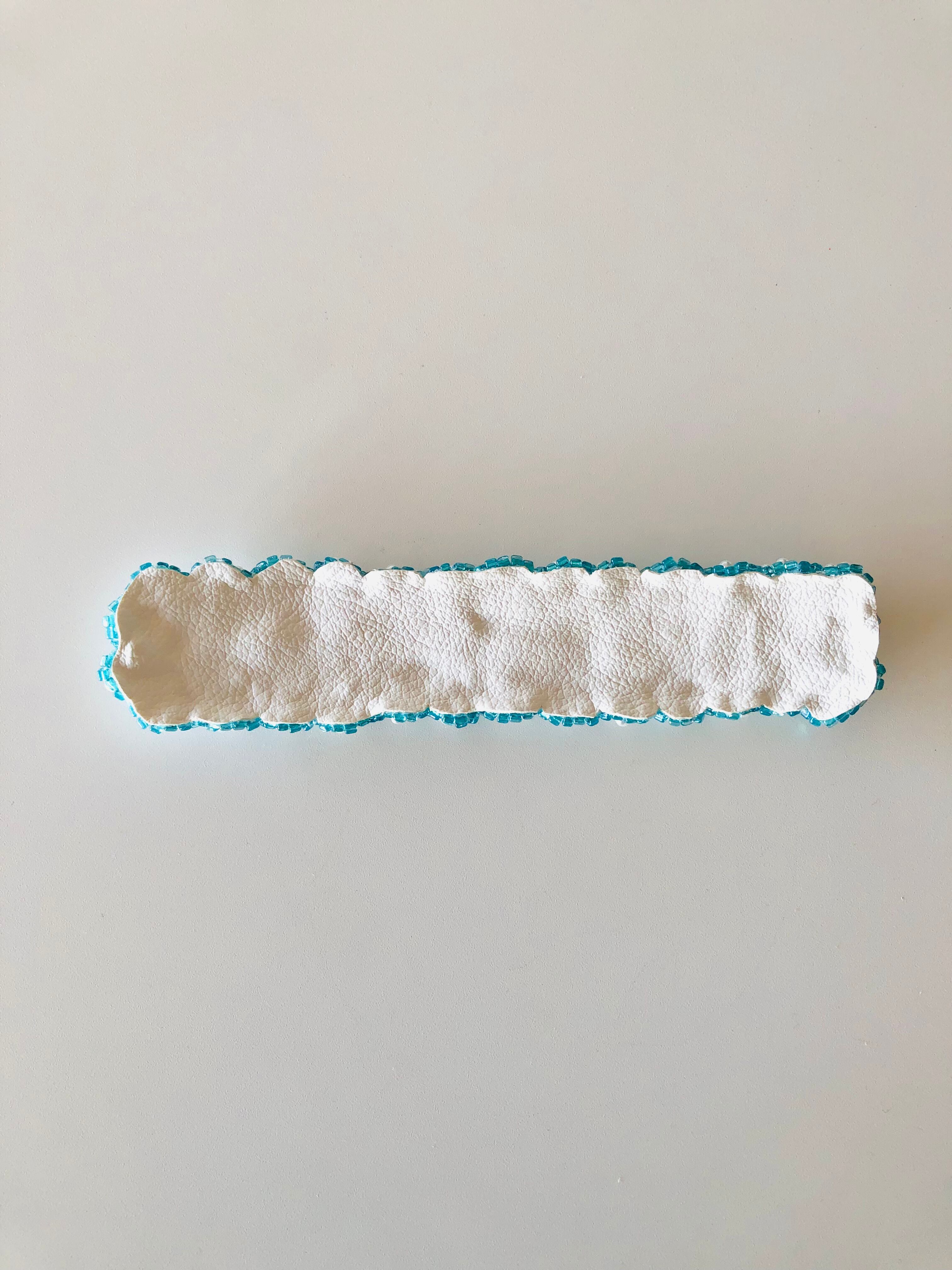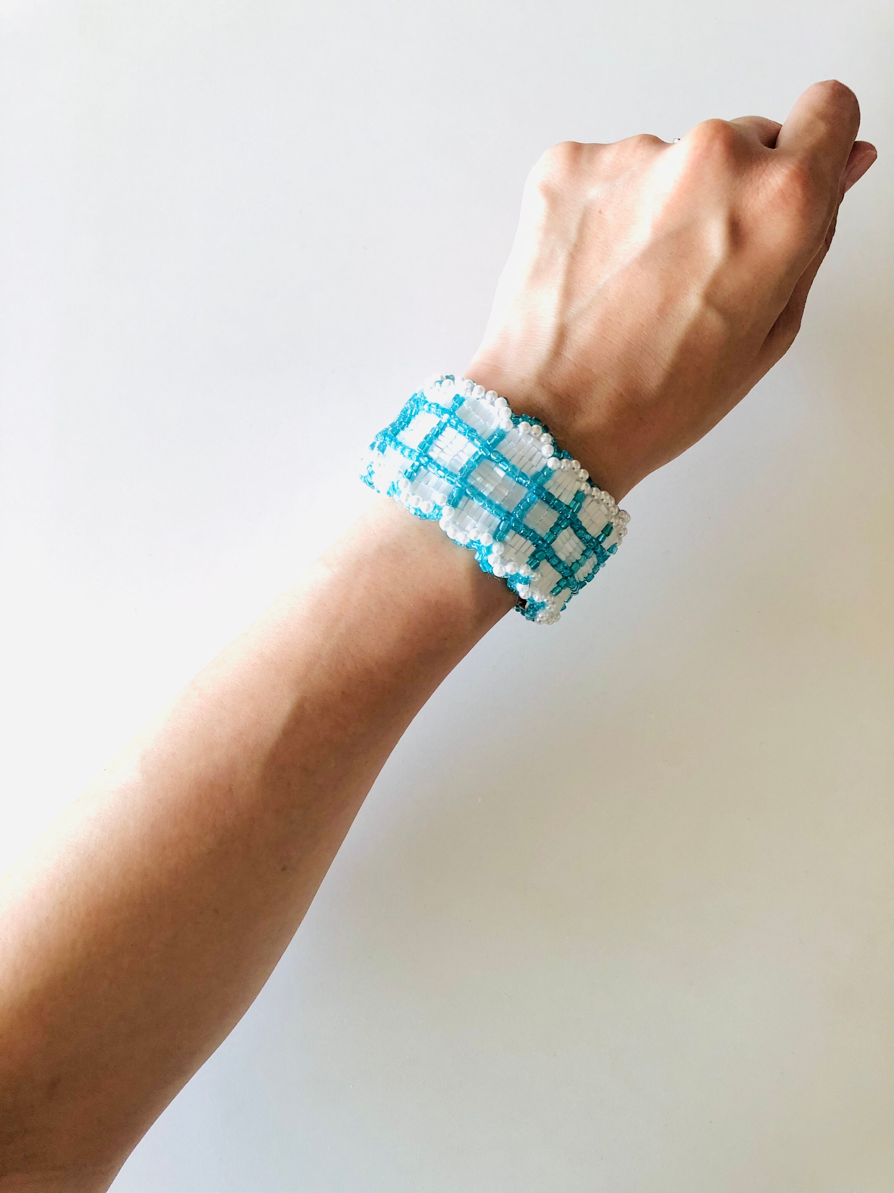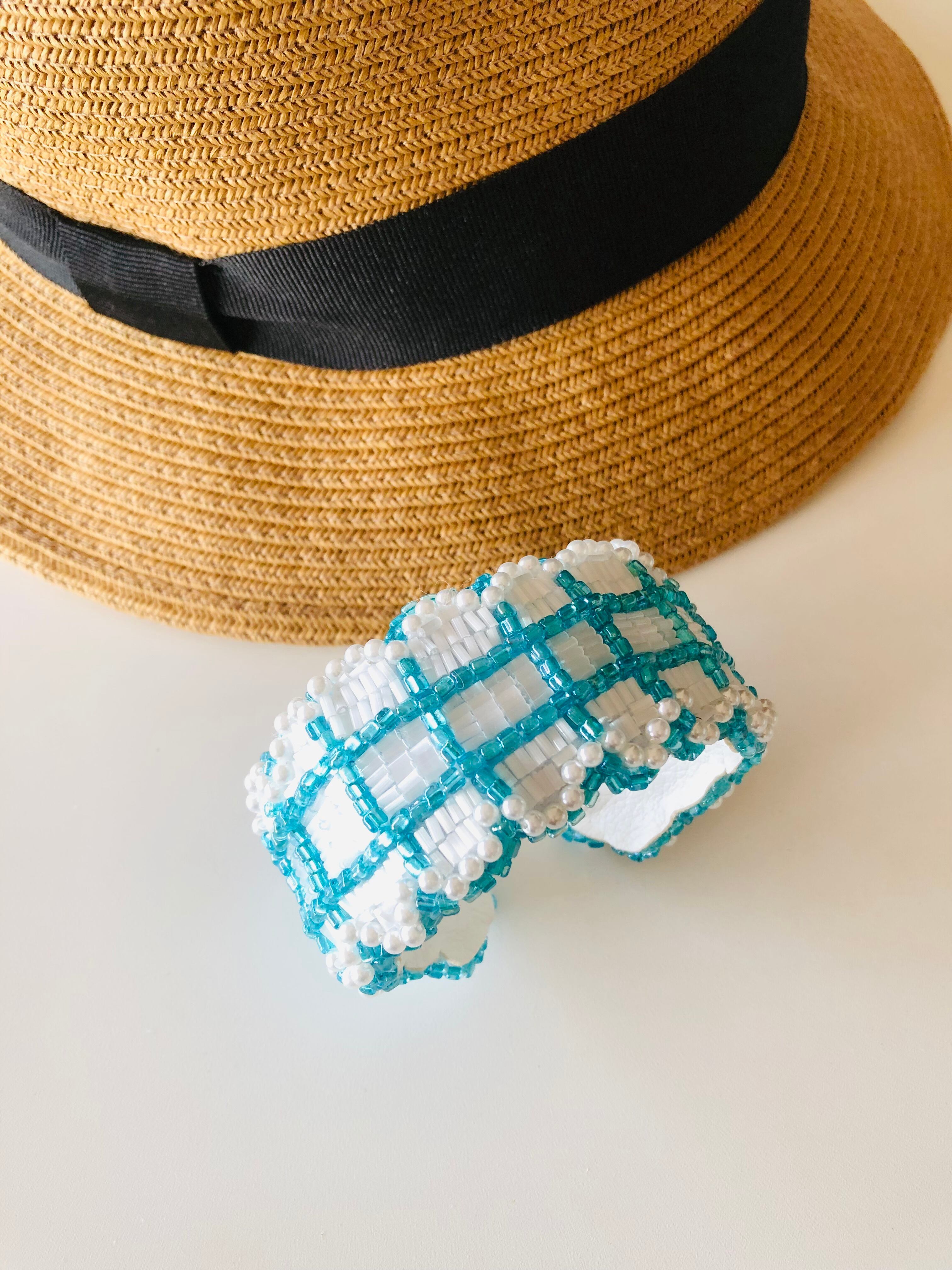 スカラップ型のデザインが特徴のバングルです。透明感があり爽やかなソーダ色のビーズと、光を浴びて煌めくホワイトカラーの小竹ビーズのコントラストが最高な一品!ビーズ数も多いこちらのアイテムは縫い付けに時間を掛け、丁寧に仕上げています。ワイヤー入りなので、お好みのフィット感に調整可能。