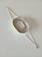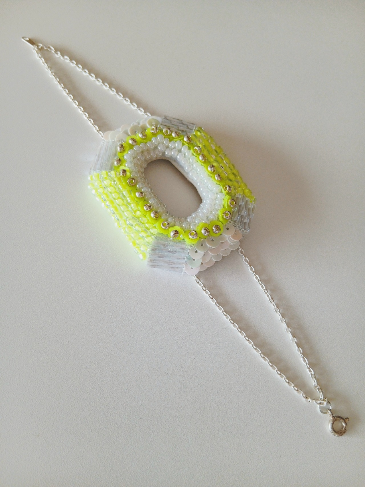 鮮やかなライムイエローのガラスビーズが印象的なブレスレットです。クリアなスパンコールとシルバーカラーのビーズも調和し、手元を明るく演出します!中心をくりぬいた八角形のデザインは他では中々御目に掛からないフォルムかも。