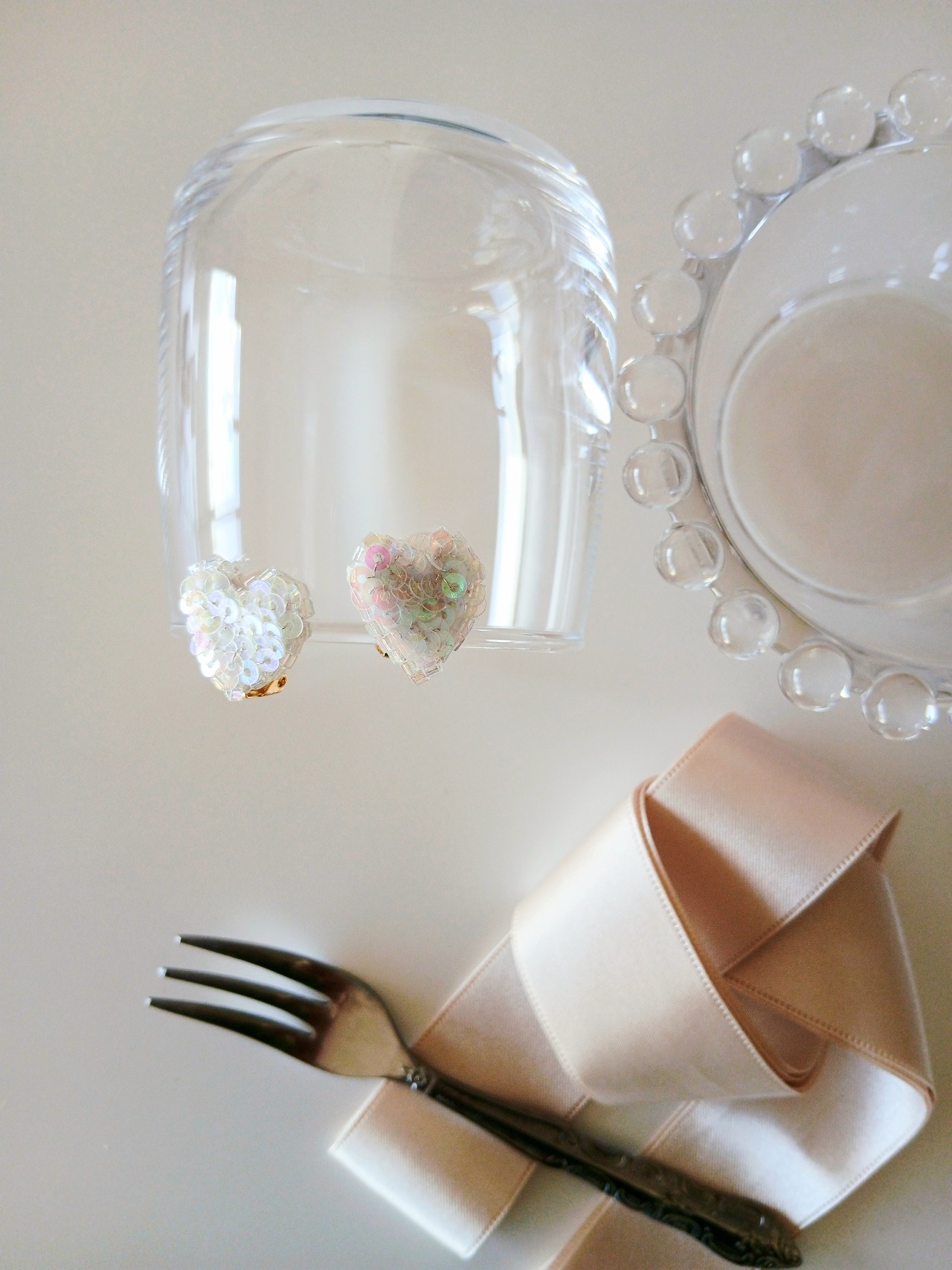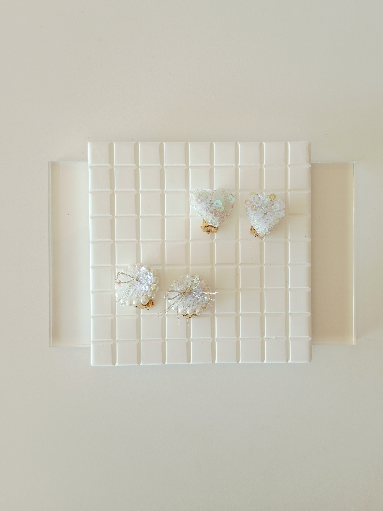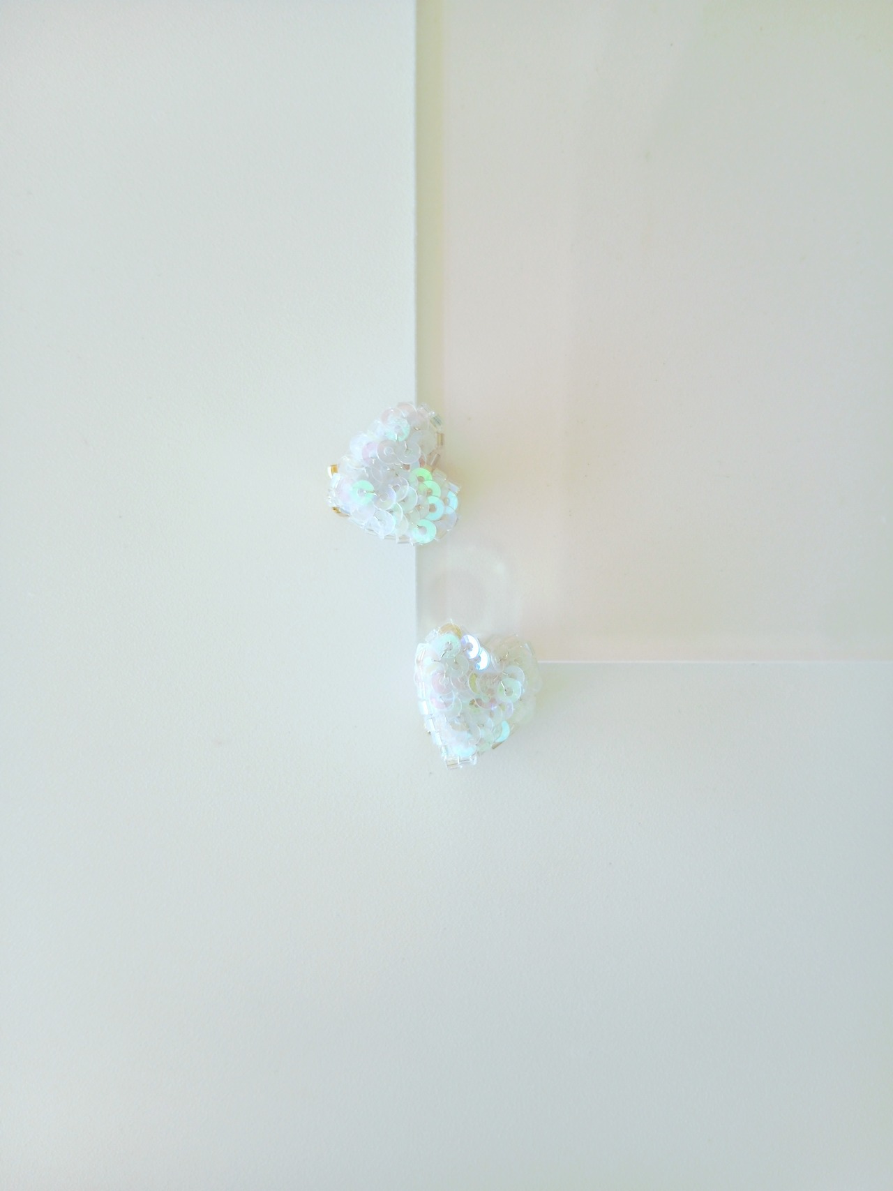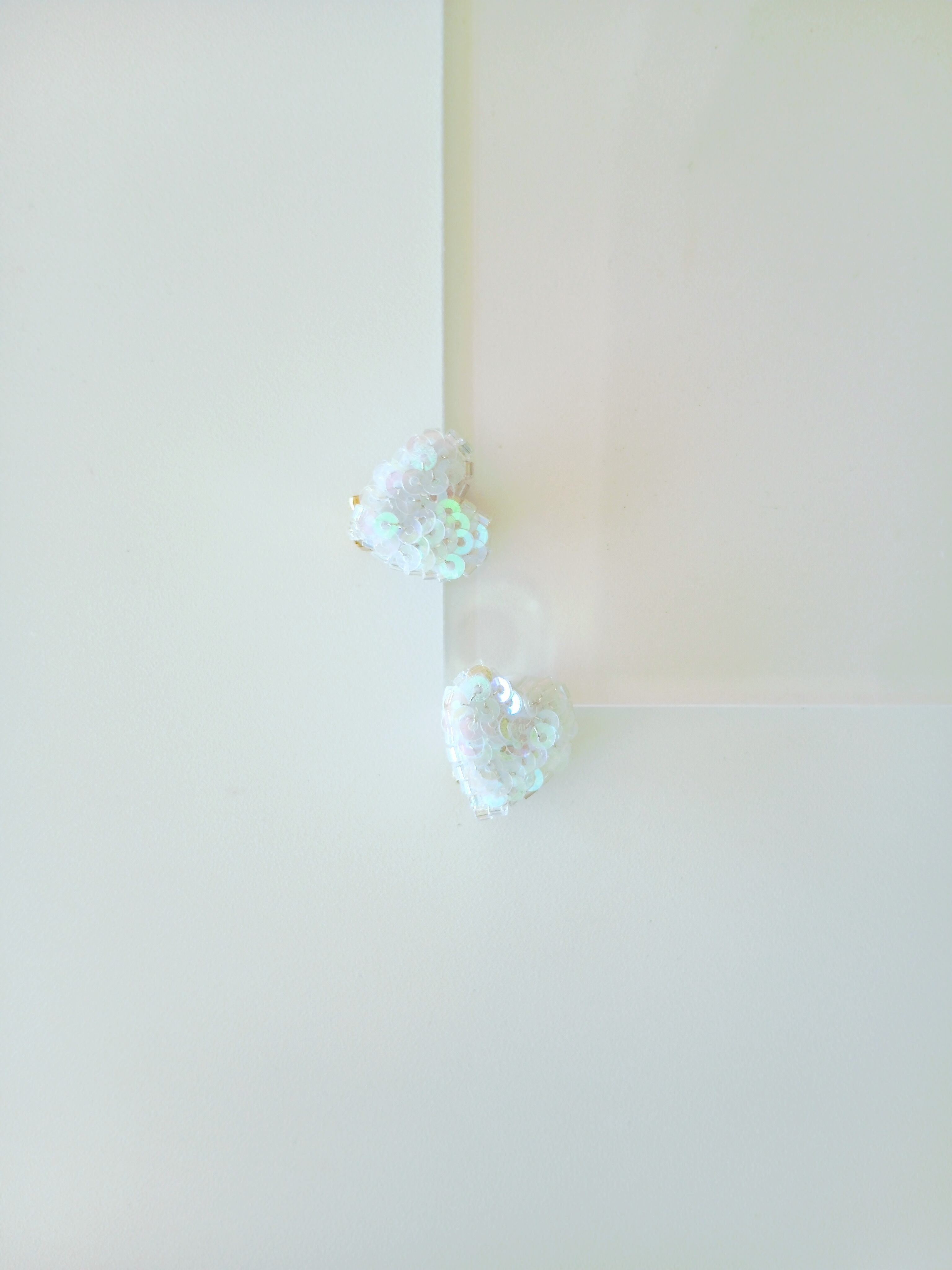 光を纏い煌めく2㎜のオーロラスパンコールを使用した、エレガントなハート型イヤリングです。光の角度によって美しい虹色が浮かび上がり、耳元を魅了するデザインとなっています!