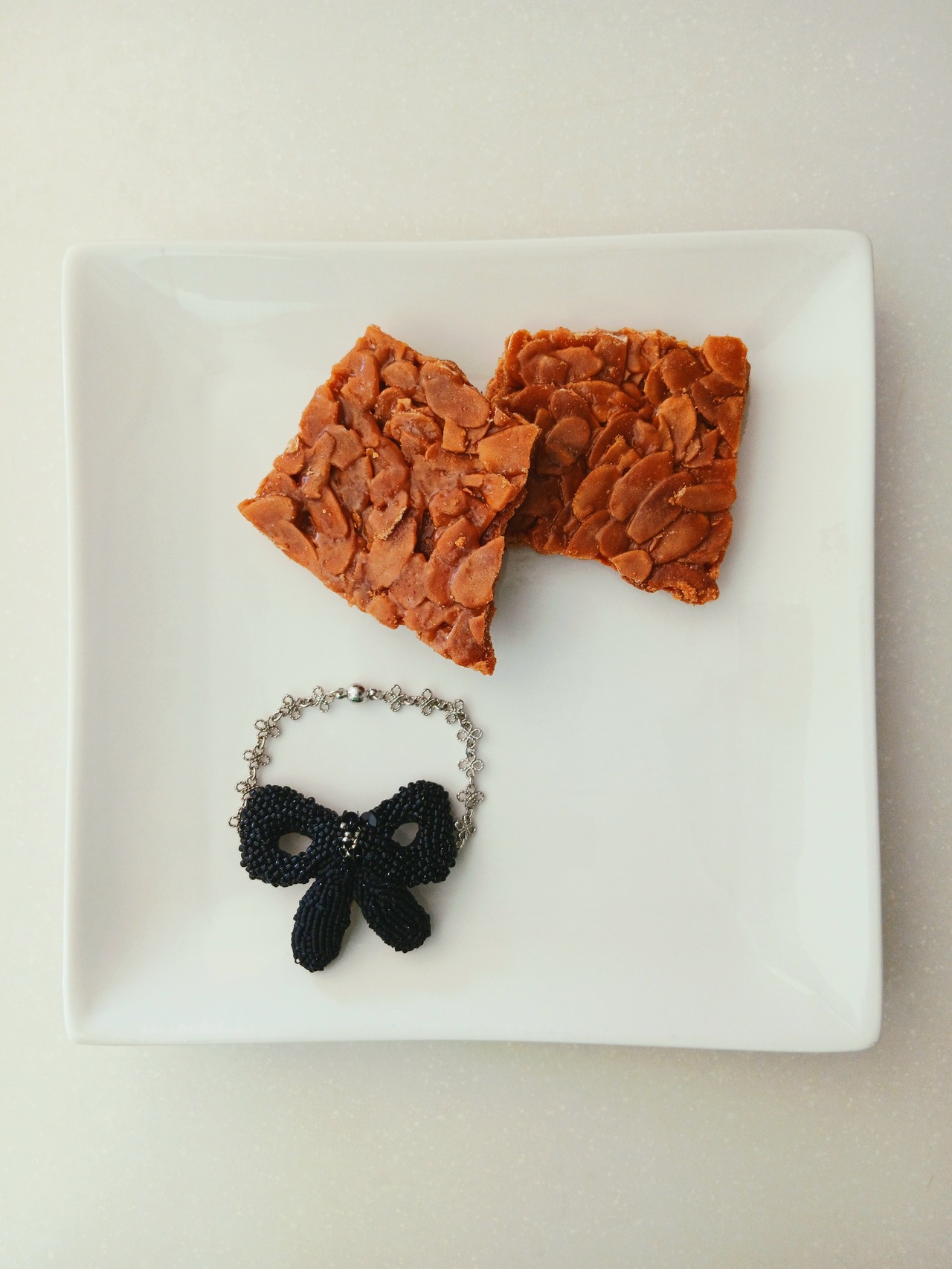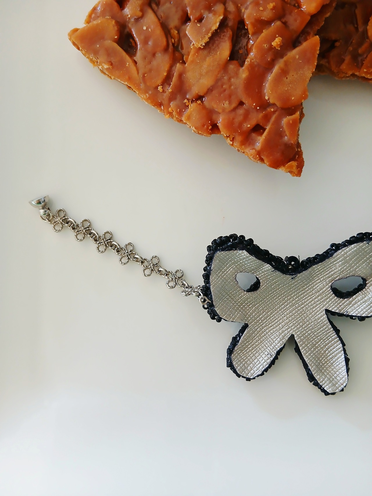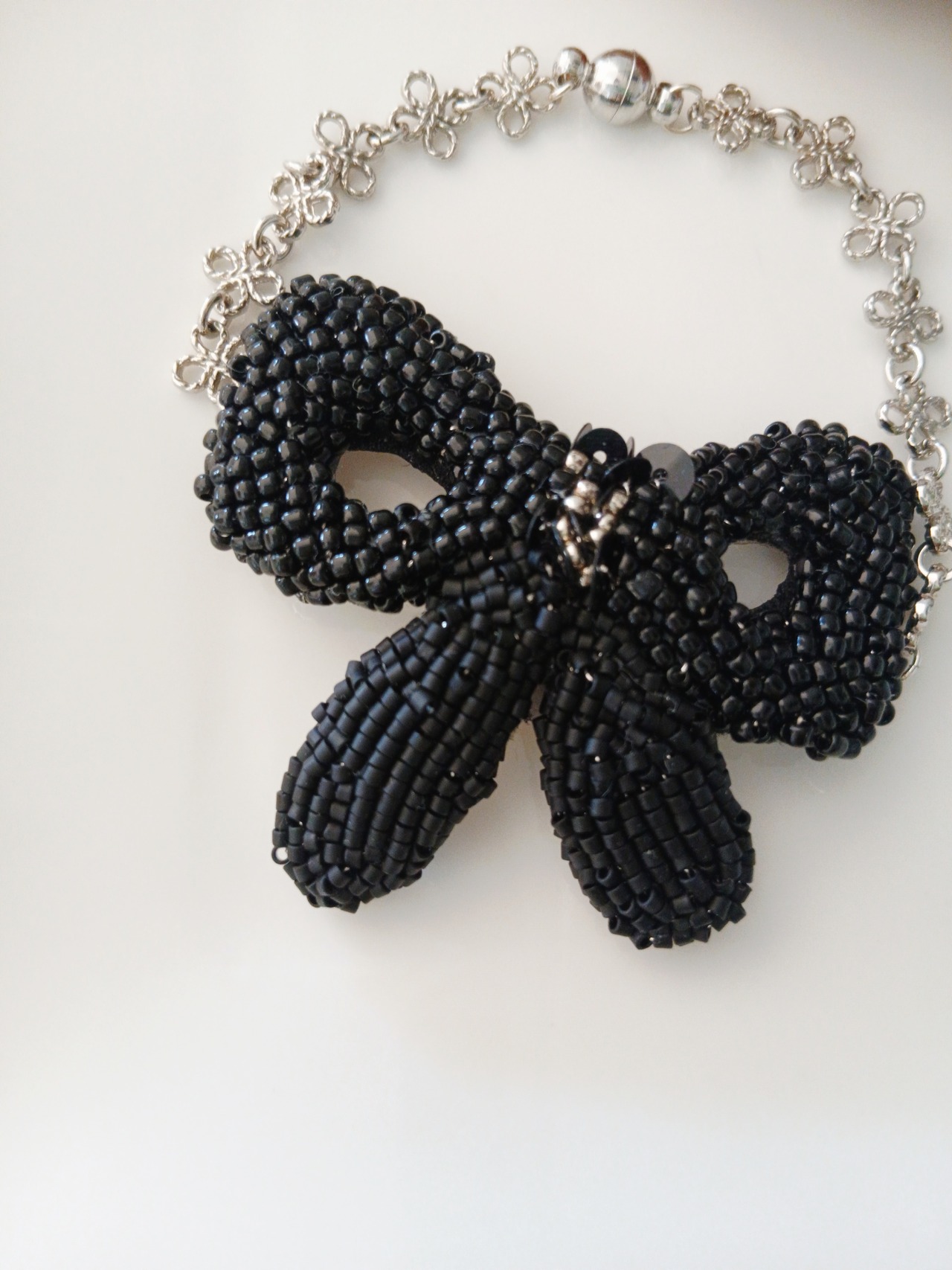 リボンの上部には艶ありのビーズ、下部にはマットなビーズを使用しています。アンティークビーズ独特の光沢が落ち着きと深みを演出し、存在感のあるデザインに仕上げました!リボン形状は丸みがあり柔らかな印象に。