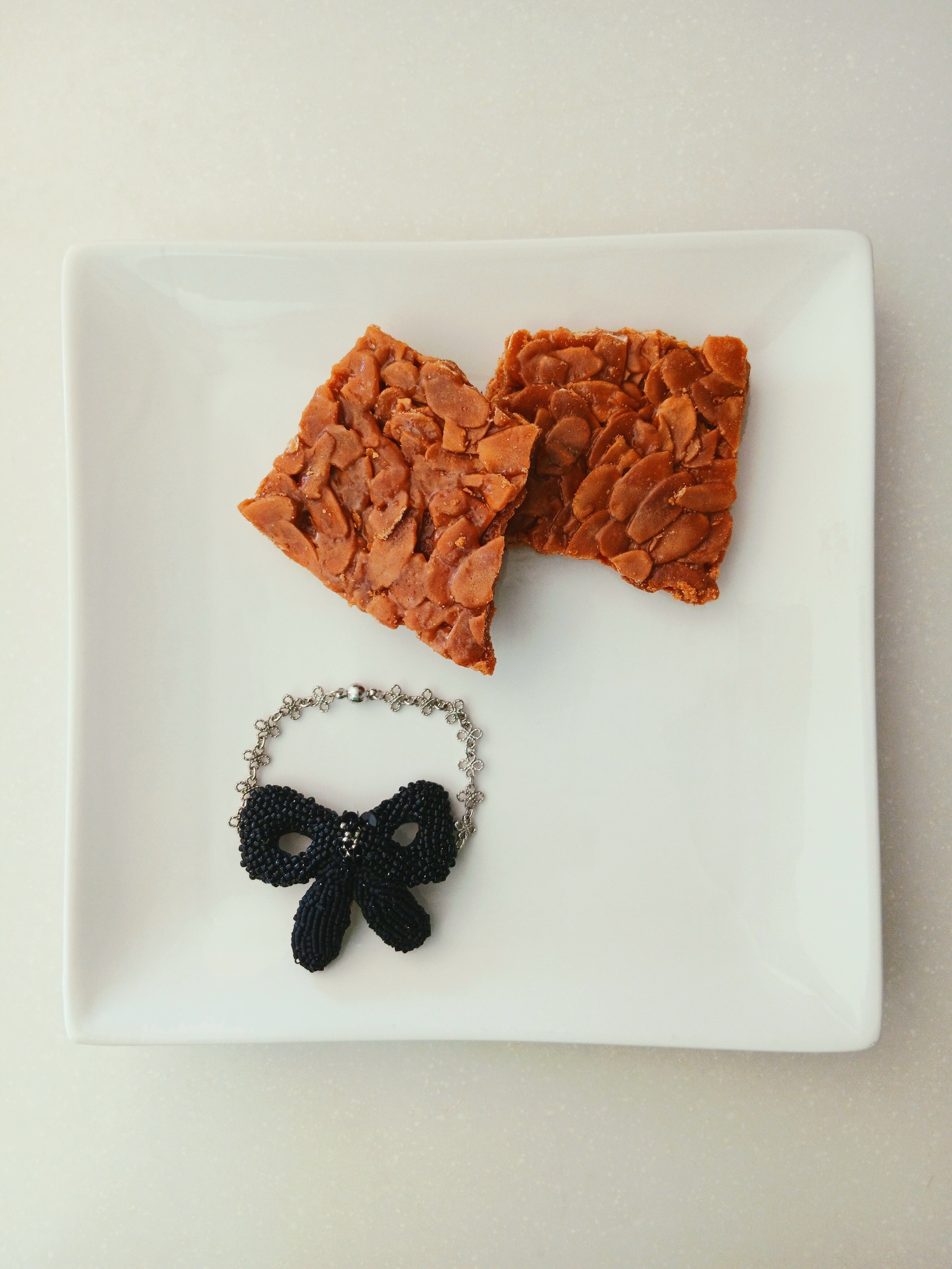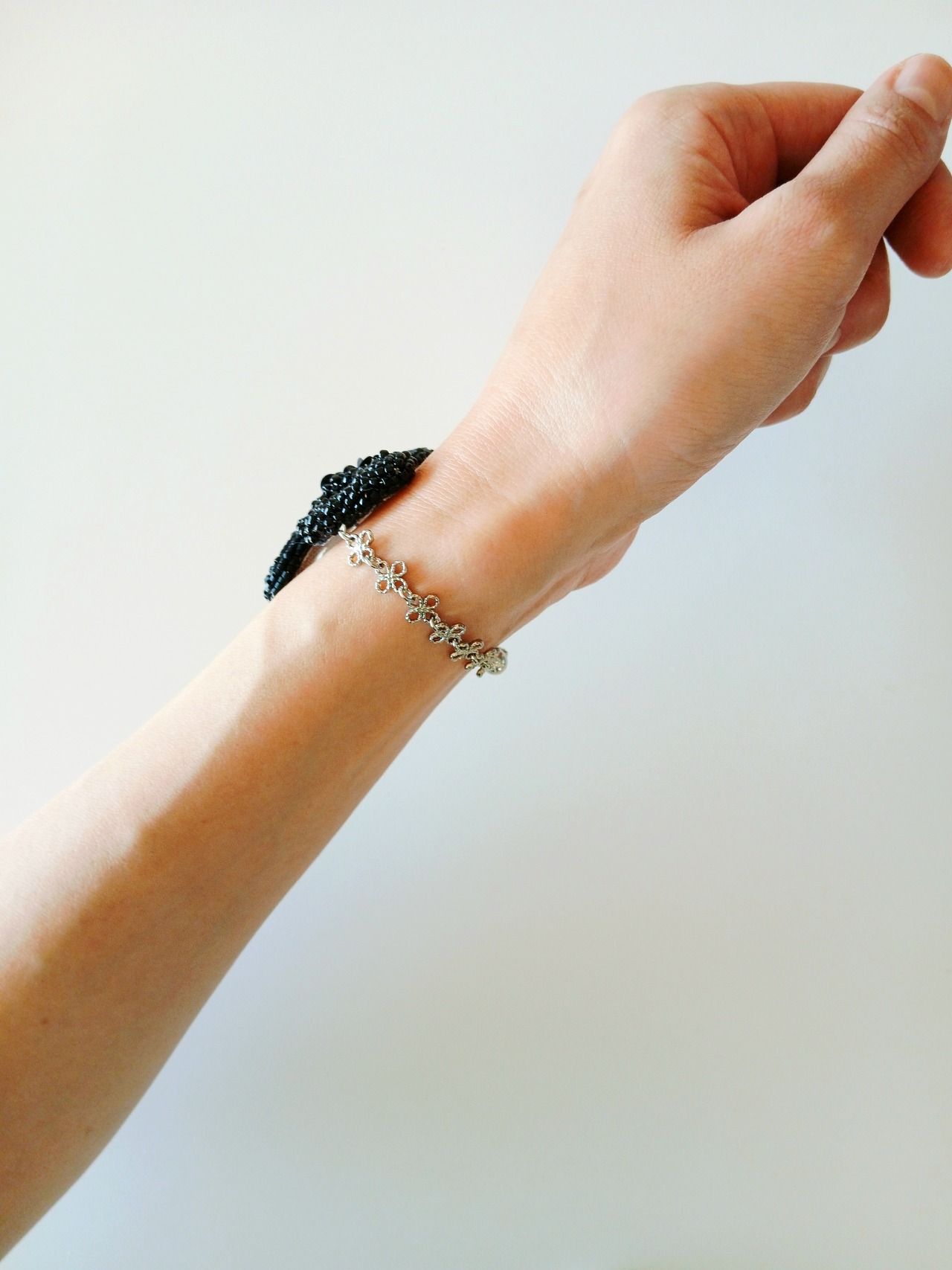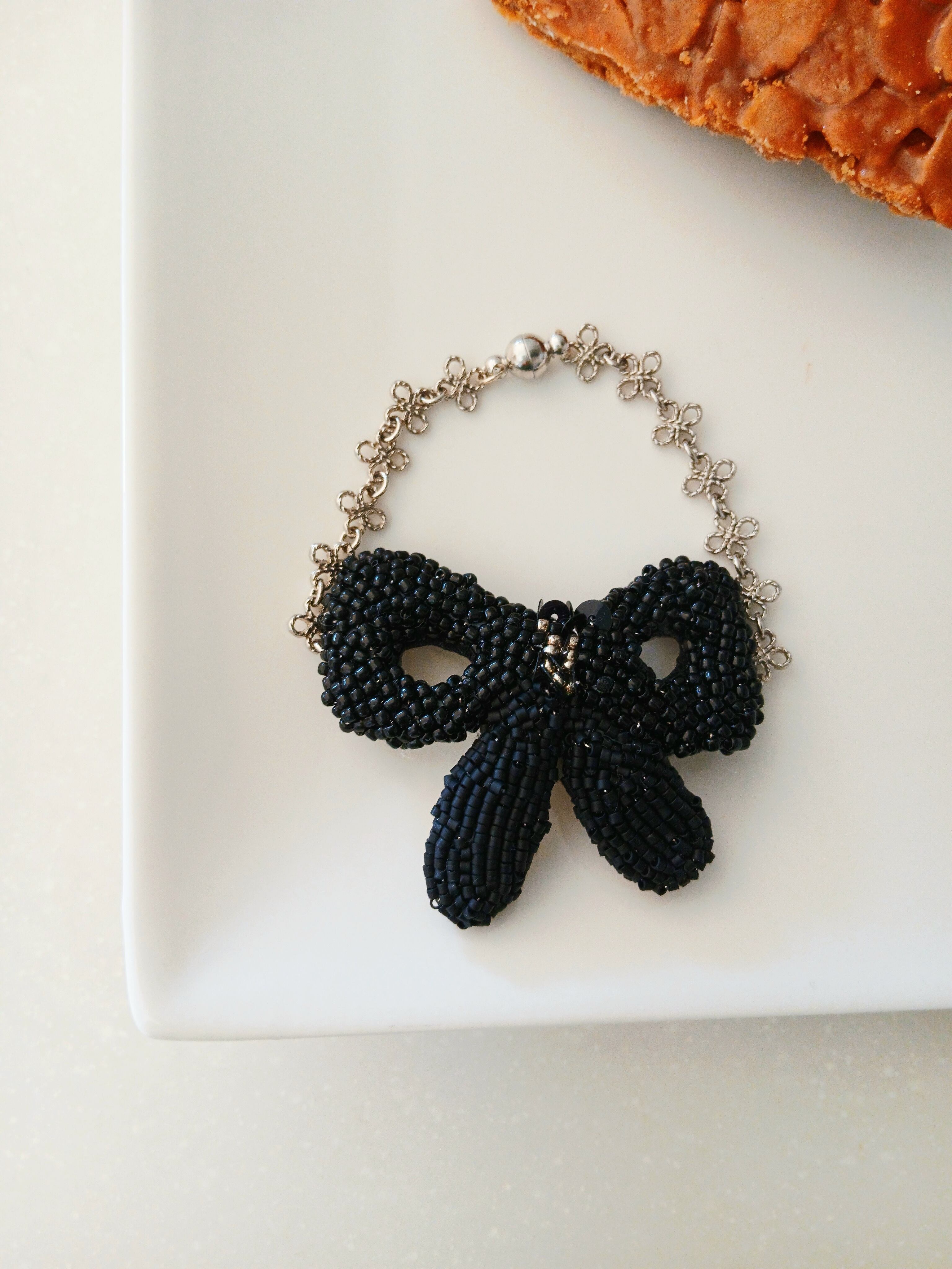 深いブラックのアンティークビーズを使用した、シックなリボンブレスレットです。