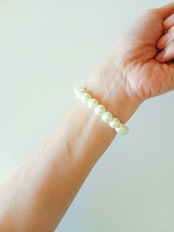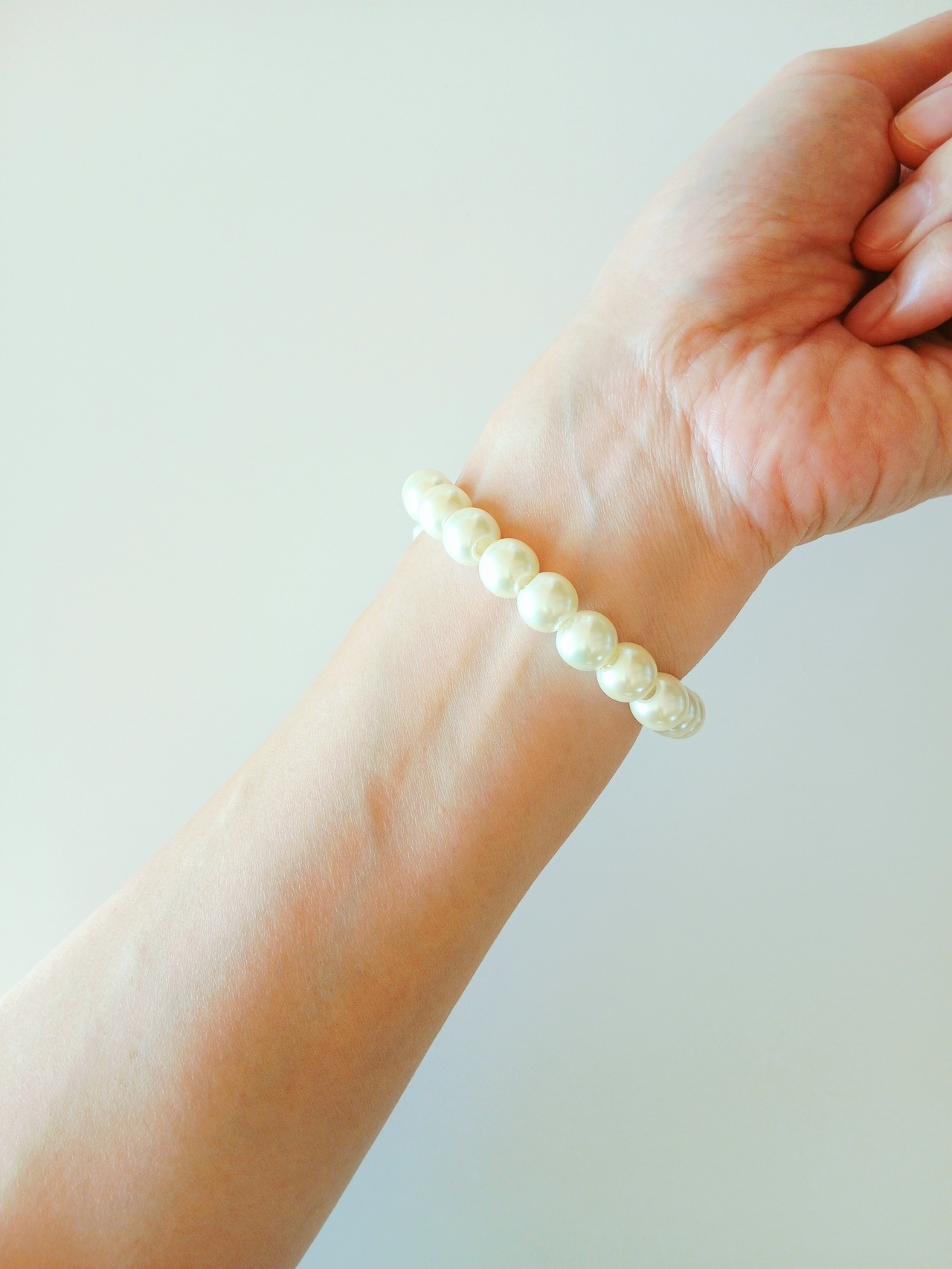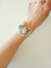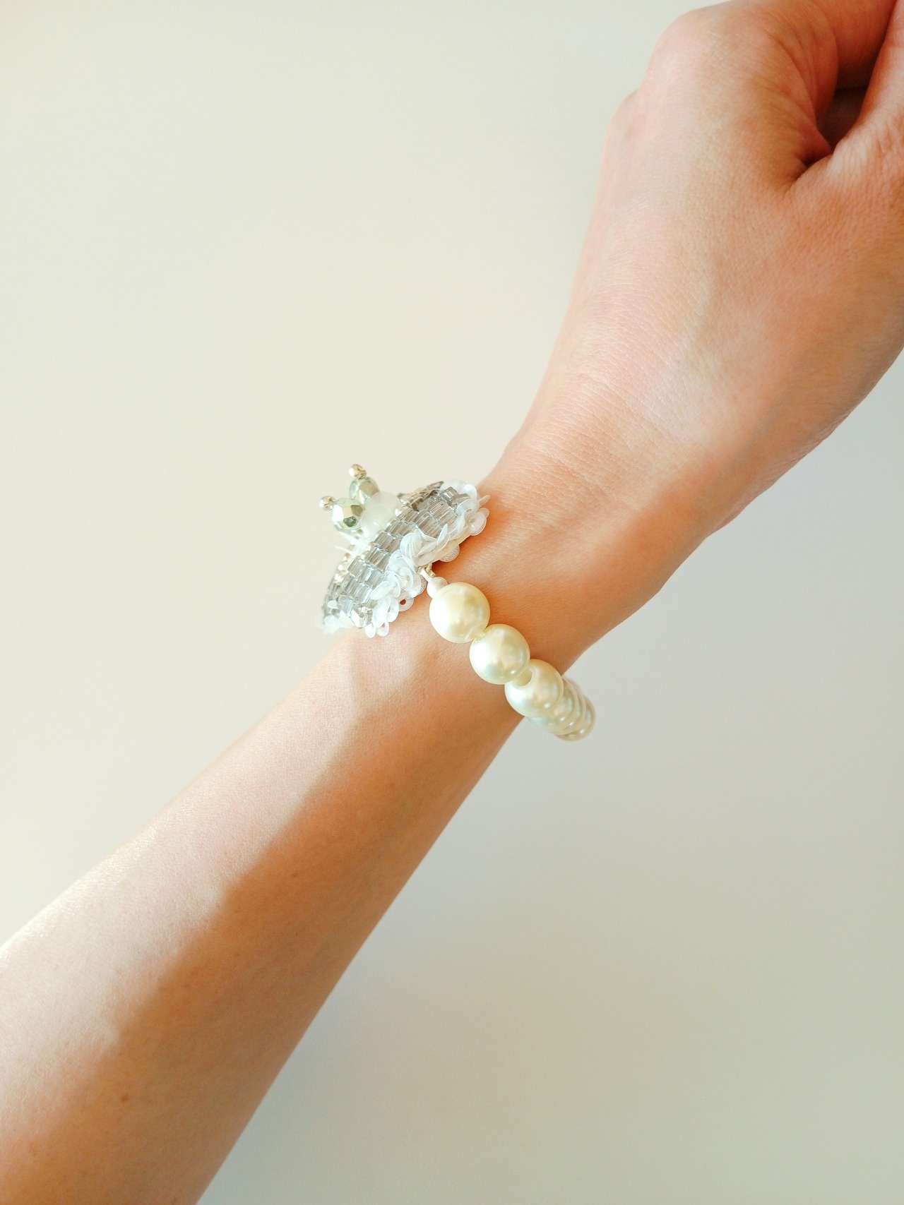 ちょうちょのような愛らしいモチーフが魅力的なブレスレット。セミマットな3㎜のスパンコールと透き通るグレーが美しいビーズが華やかさを添え、手元を美しく彩ります!パールビーズの部分は伸縮性のあるコードを使用し、着脱も簡単です。