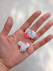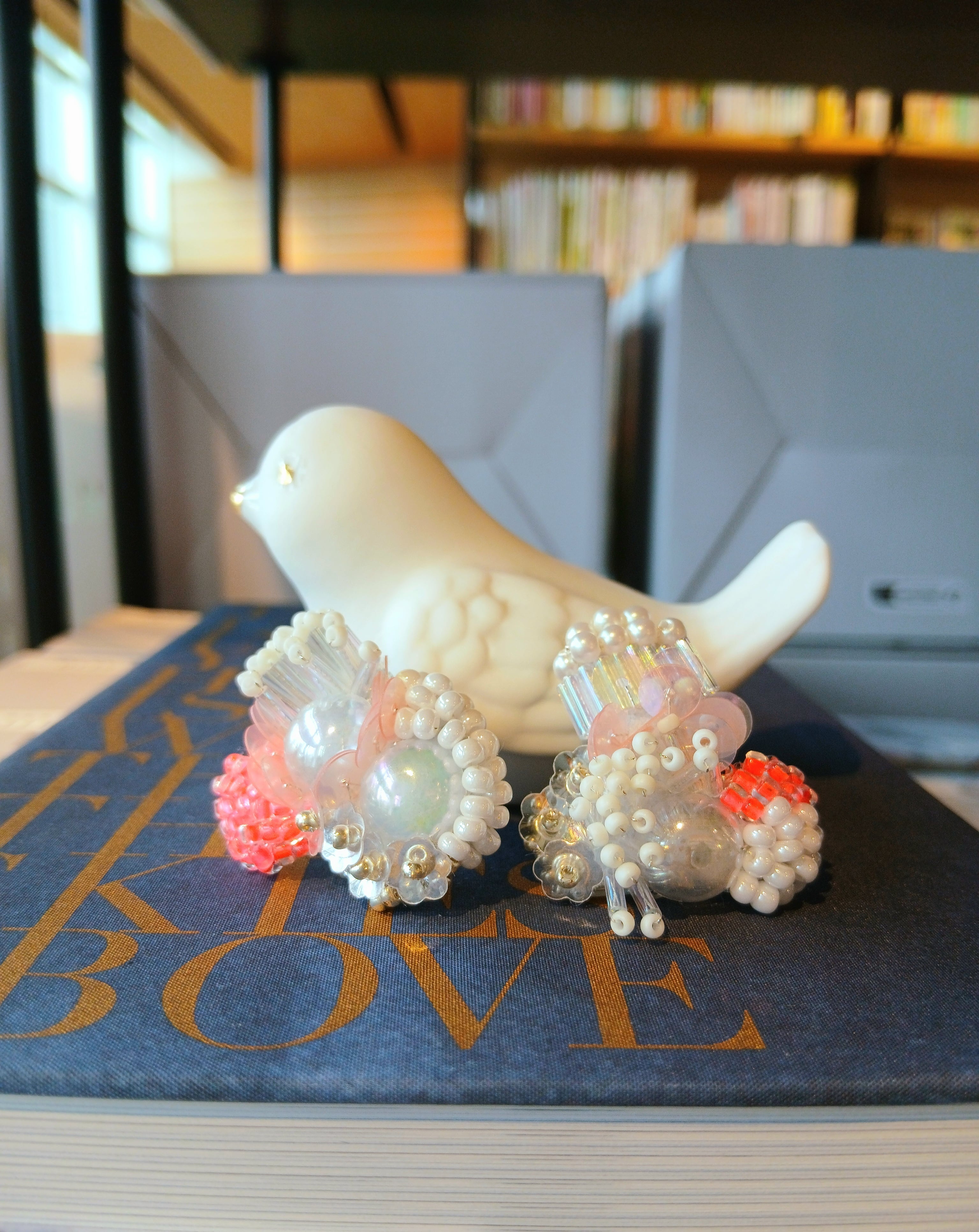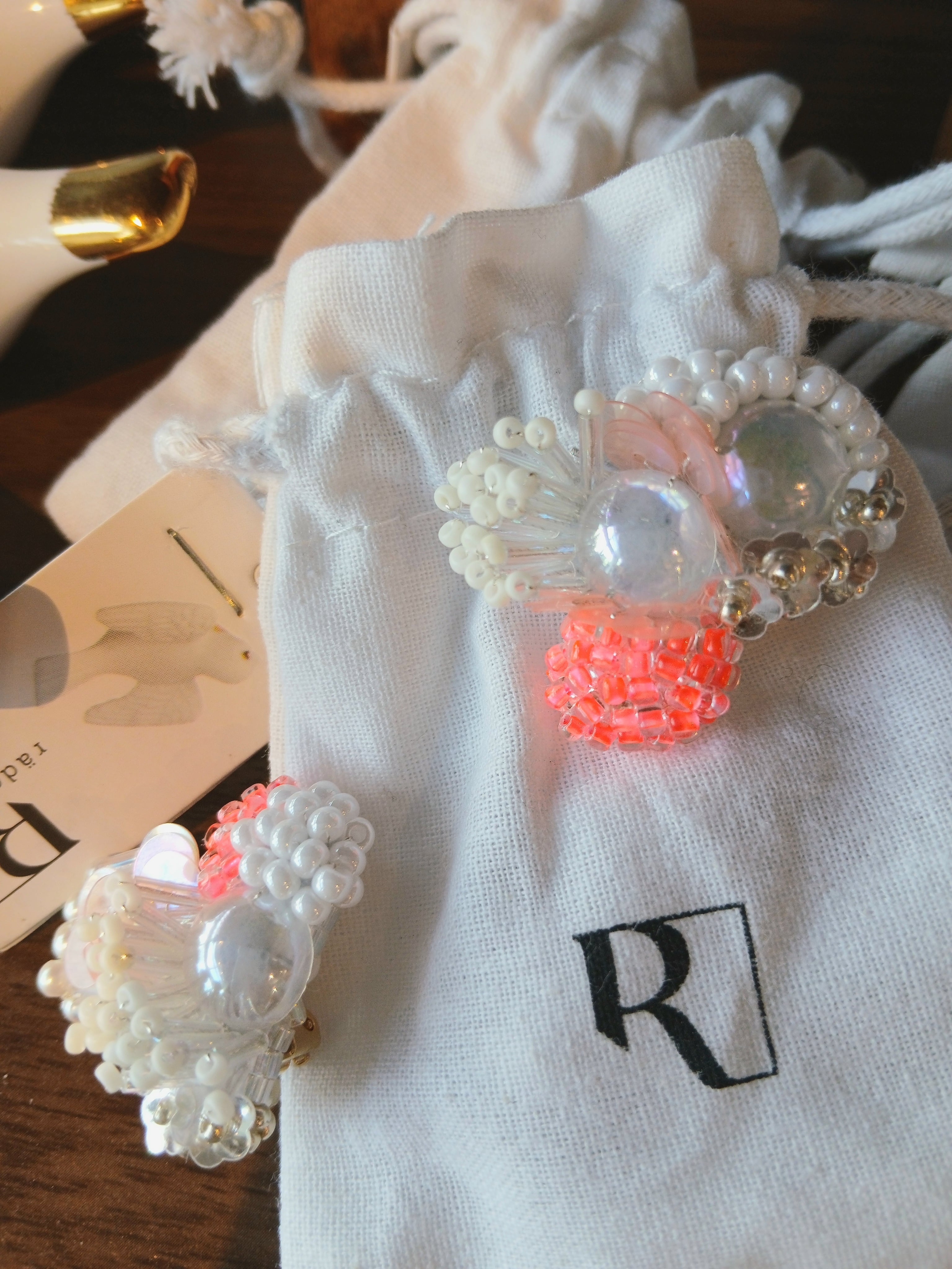 鮮やかなコーラルピンクのビーズが目を引くイヤリング。竹ビーズや希少なドーム型のスパンコールを贅沢に使用しています。