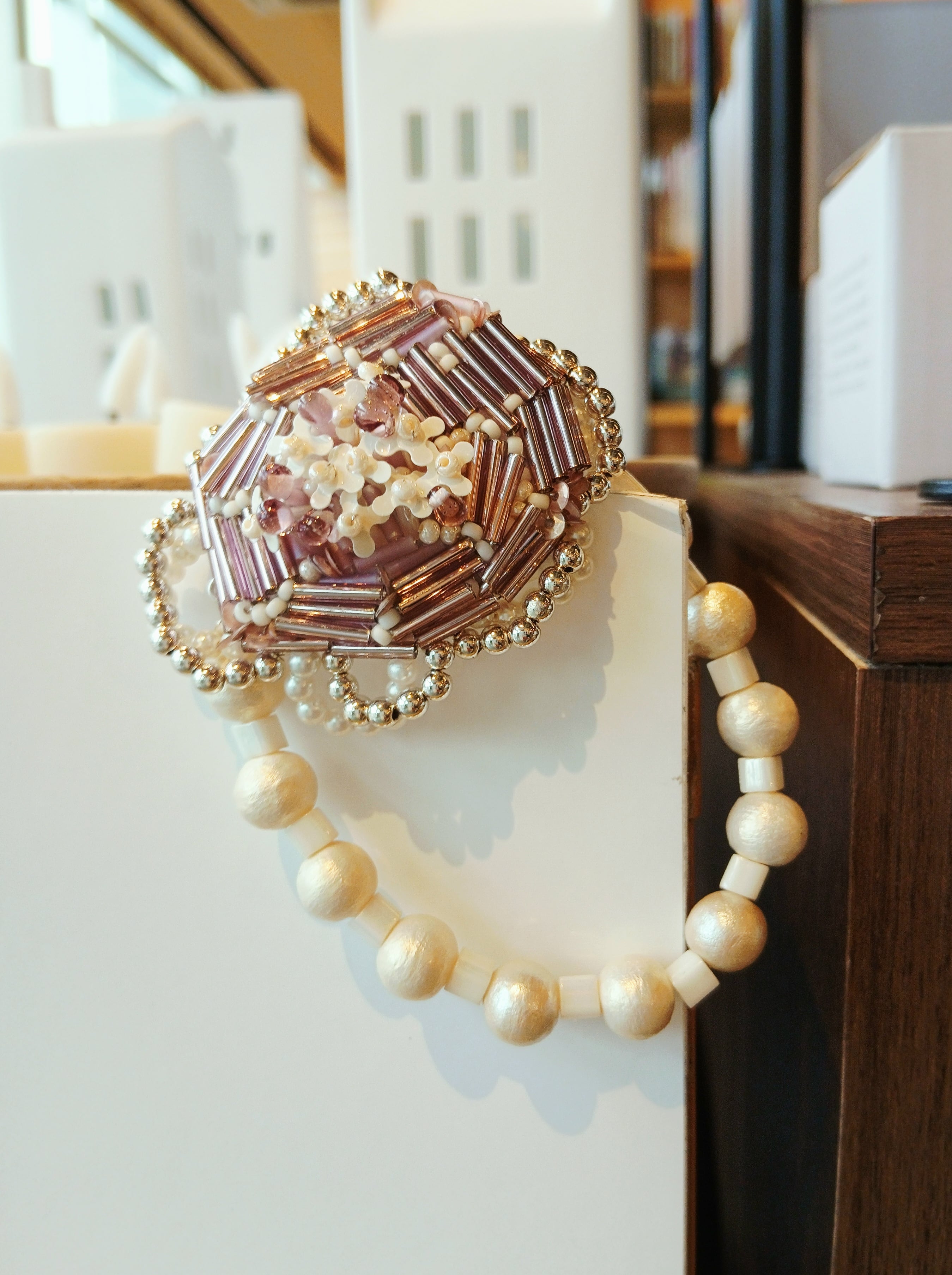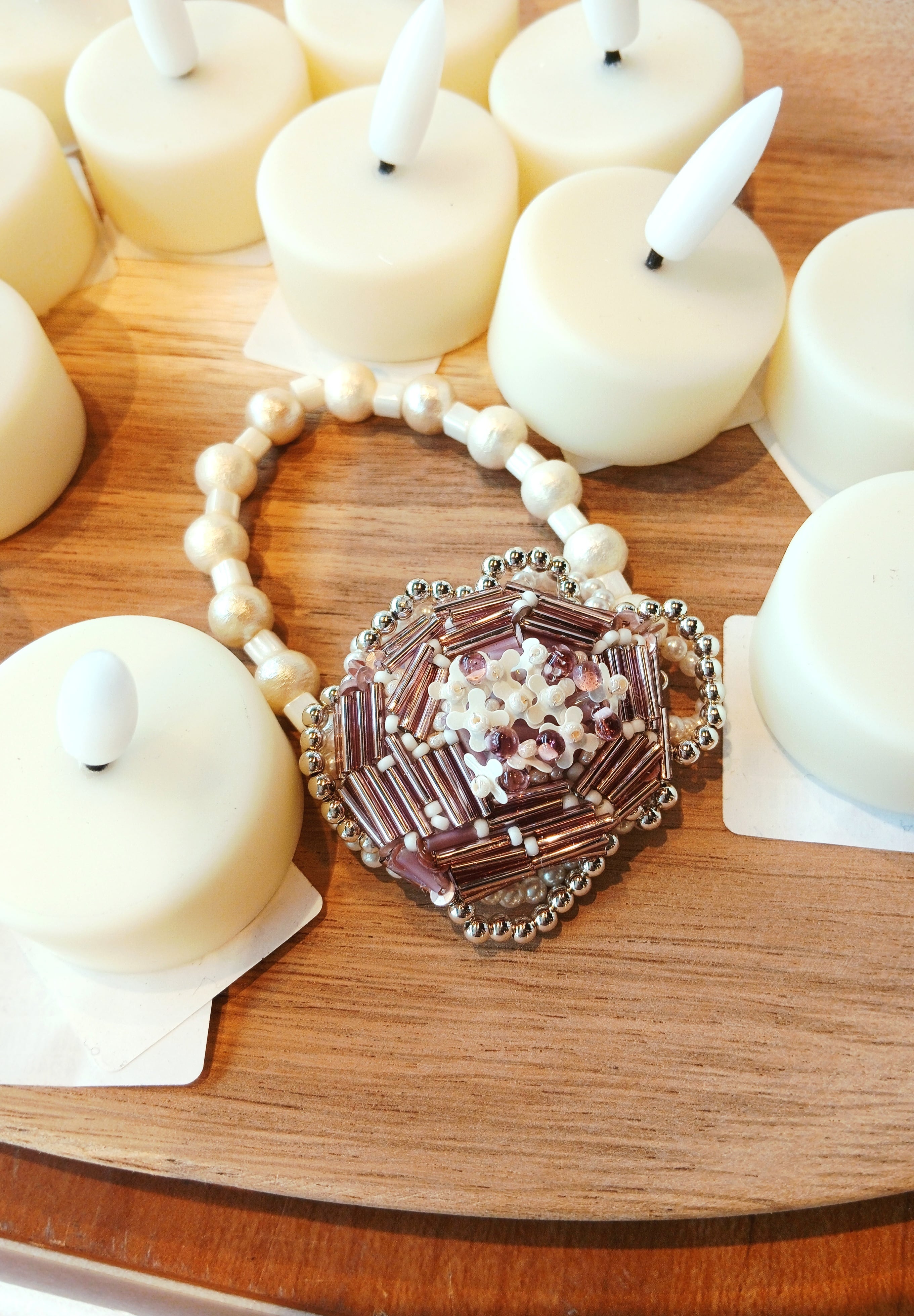シャイニーなパープルの竹ビーズで可憐なお花を表現したオリジナルデザイン。モチーフの周りには、パールビーズとメタルビーズにワイヤーを通して楕円に形作って花びらを再現♡