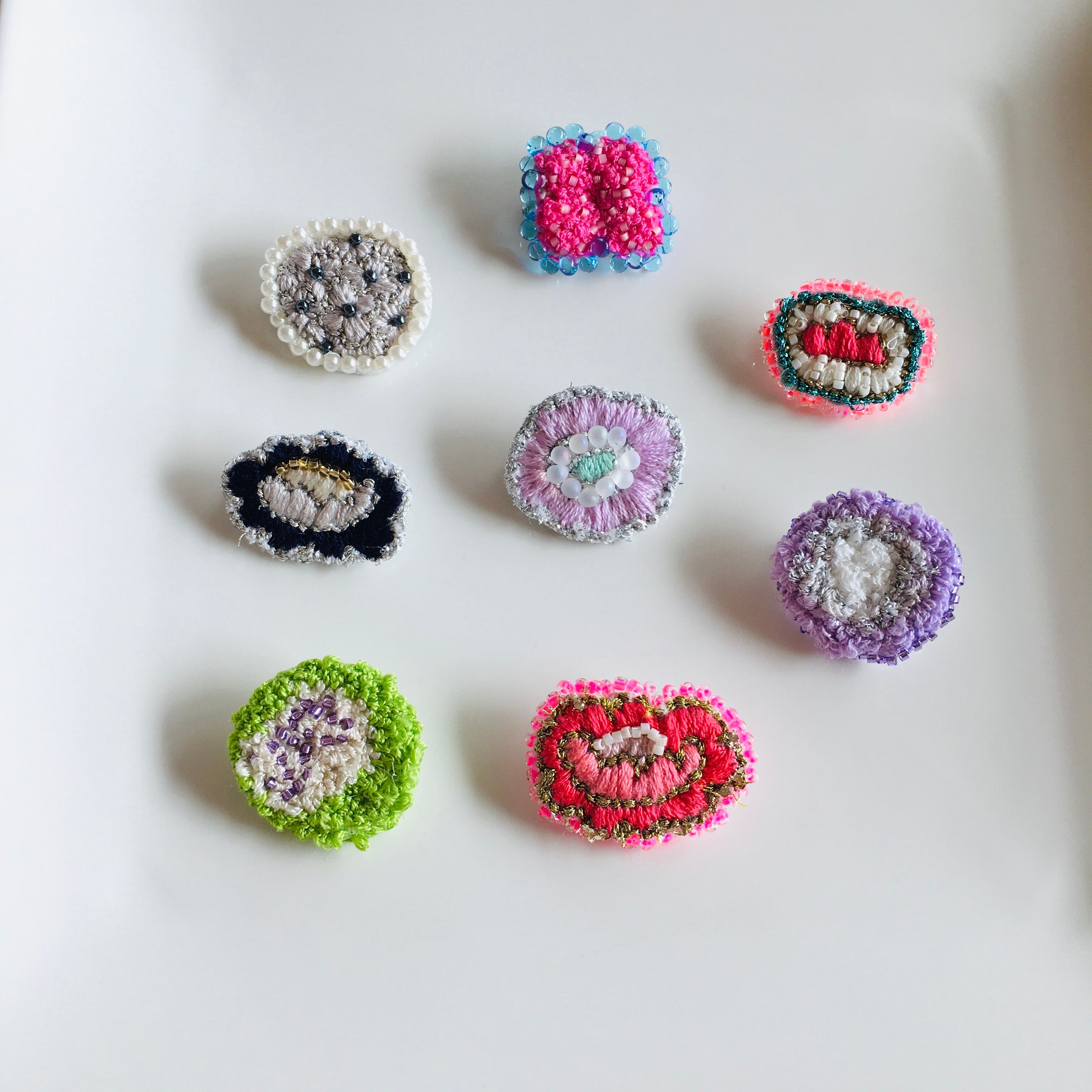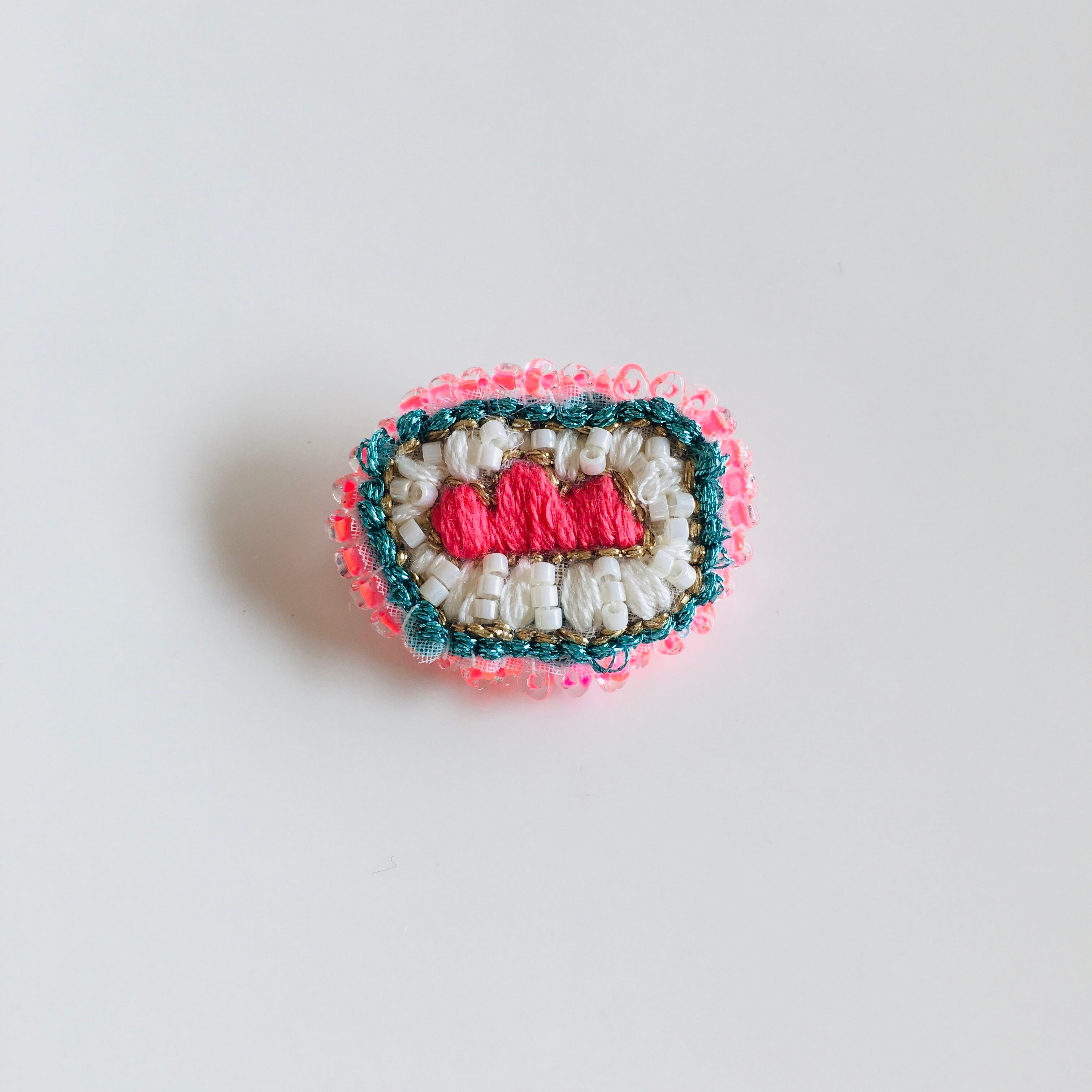 赤味のあるピンク、ラメのグリーンの刺繍糸とホワイト、ピンクのビーズを使用したブローチです。