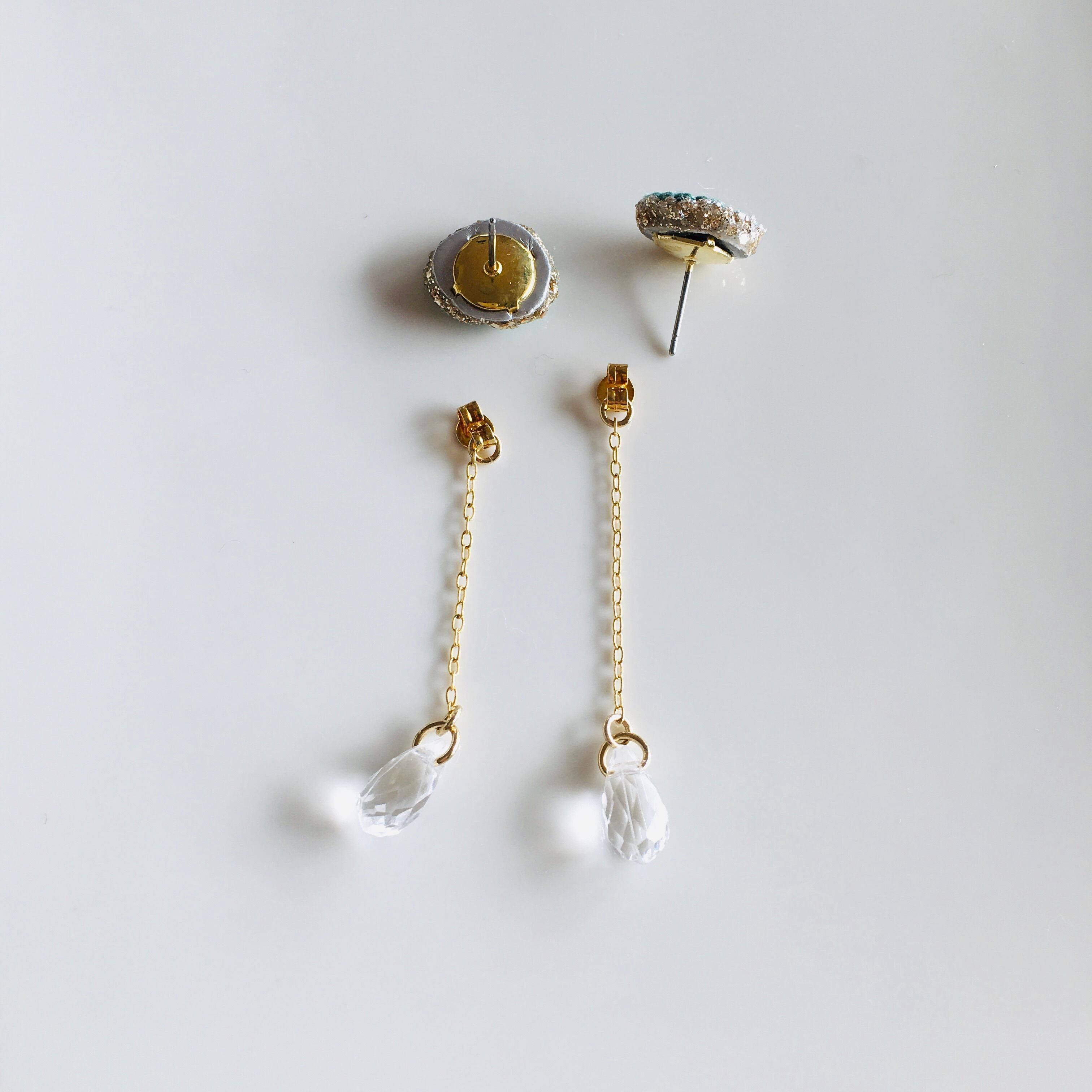 くすんだグリーンとシルバーラメの刺繍糸を使用したパーツと、キャッチ部分にチェーンとクリスタルをあしらったピアスです。