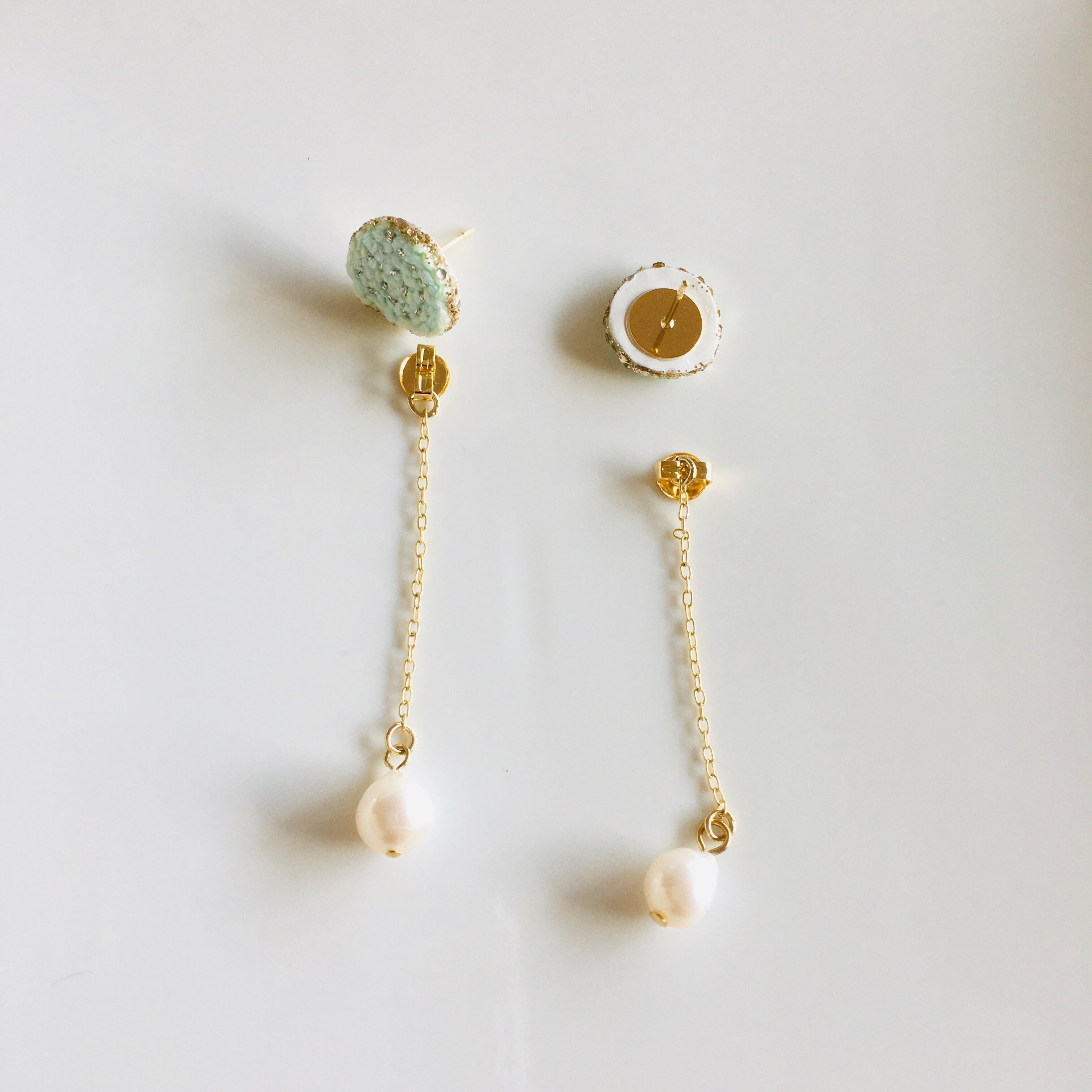 ライトグリーンと中心部にシルバーラメの刺繍糸を使用したパーツと、キャッチ部分にチェーンと天然パールをあしらったピアスです。