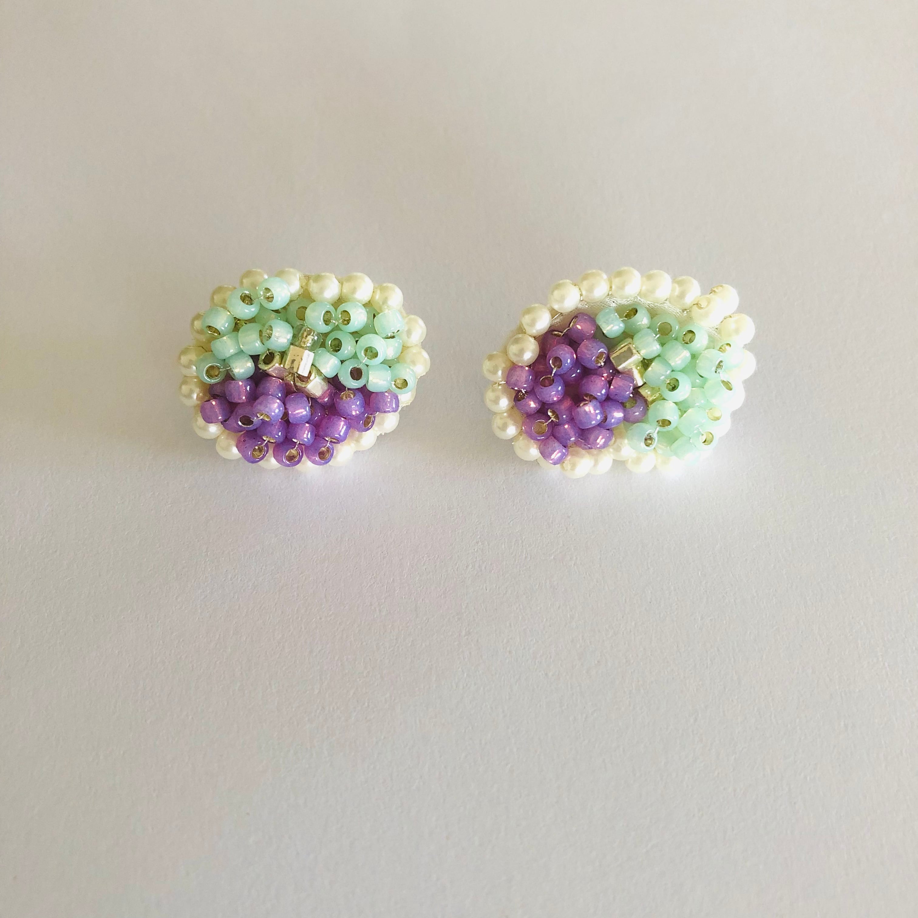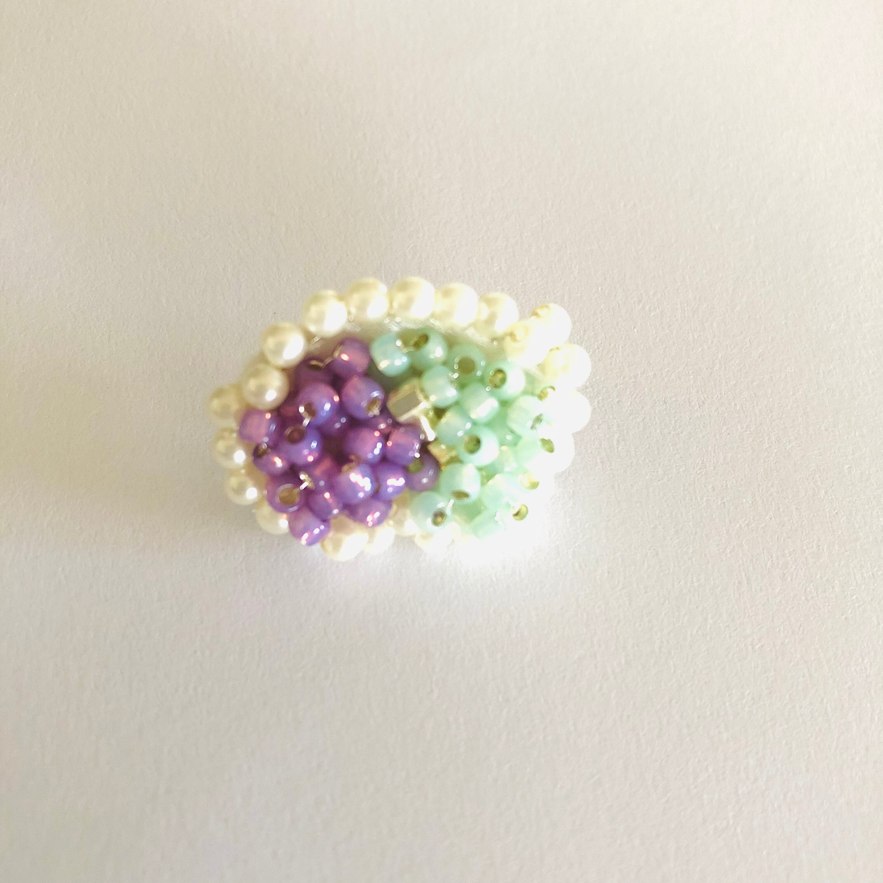 柔らかな艶を放つ、ライトグリーンとパープルのビーズをメインにパールビーズで周りを囲だデザイン。センターにはシルバービーズをさり気なく忍ばせて。