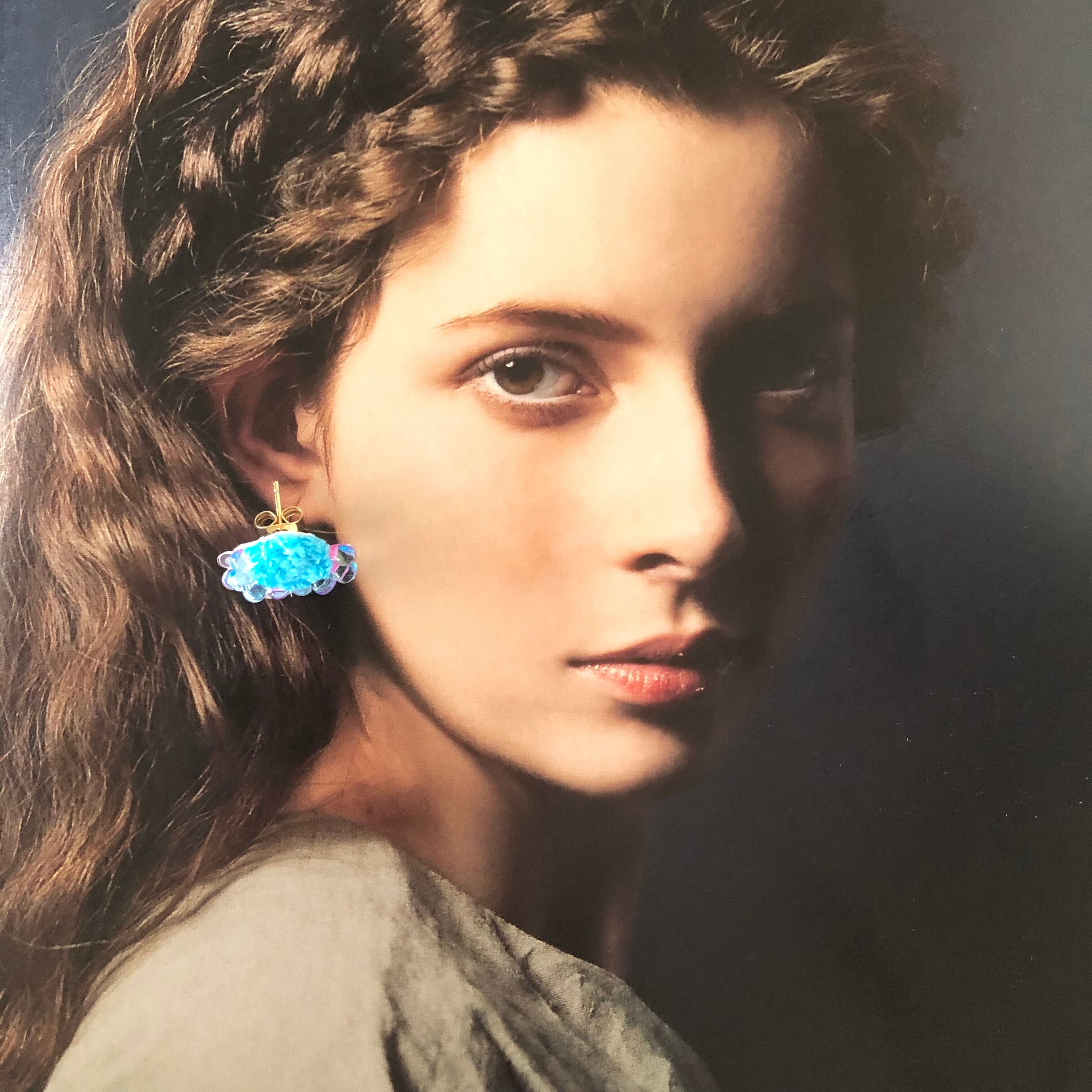 角度によってブルーやピンクに艶めく希少なビーズを使用しています。