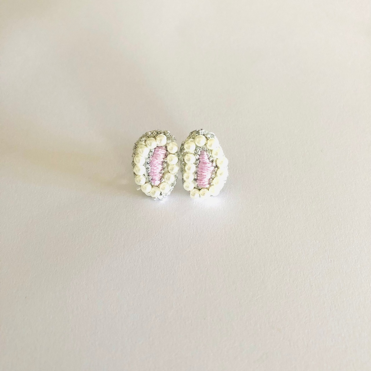 シルバーとライラックの刺繍糸でひと針ずつ仕上げました。パールとのコンビで柔らかさをプラス。